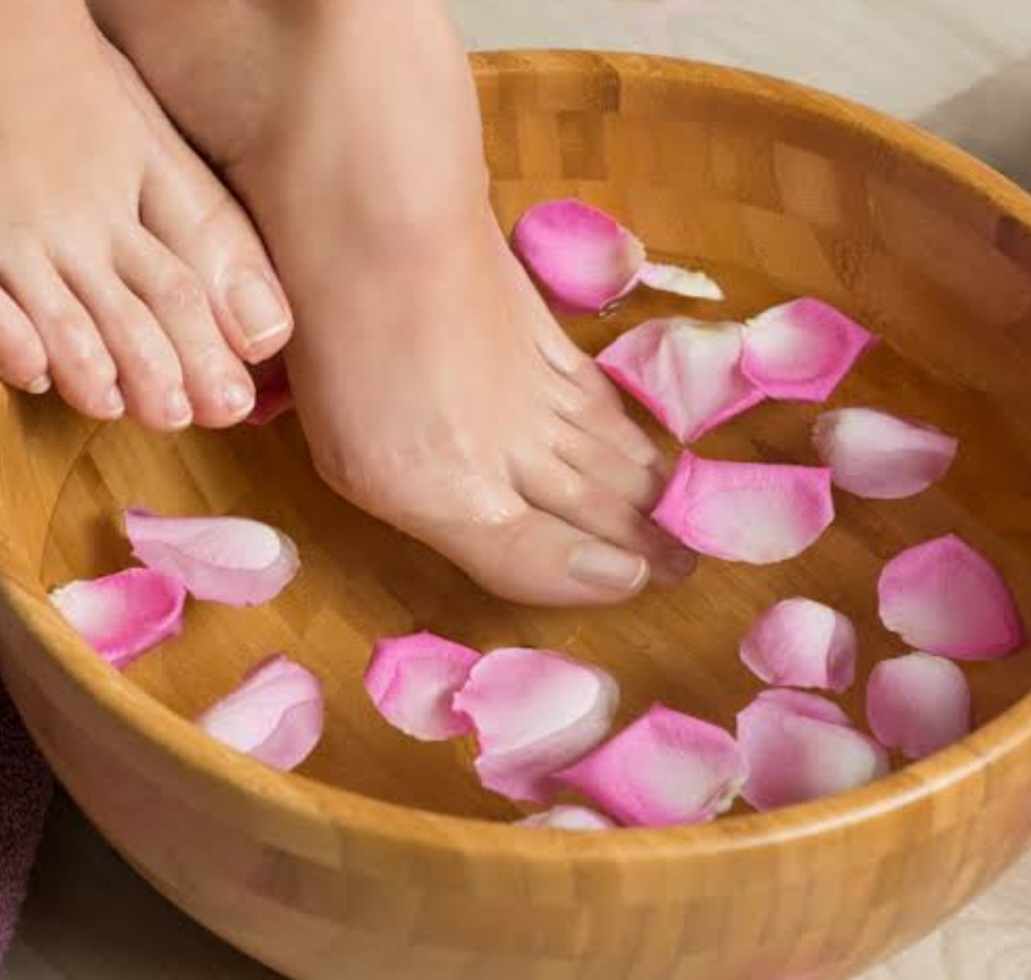 Perawatan kaki komprhensif dengan merendam kaki terlebih dahulu menggunakan garam spa, membersihkan, mengeksfoliasi (scrub),